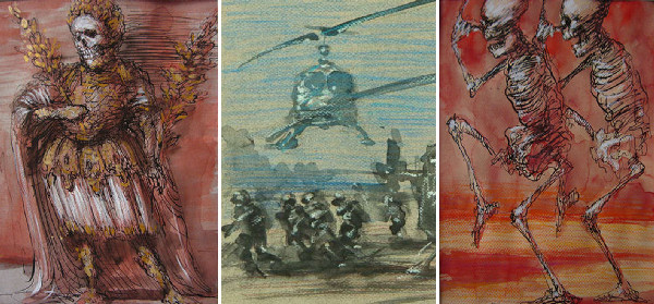Bei Béla Faragó tanzt der Tod wenigstens seit 2006. Damals zeigte das Diözesanmuseum in Eichstätt 30 in kräftigen Farben lavierte Federzeichnungen ohne Datum und Titel. Angefeuert von knöchernen Musikanten, traten die Skelette paarweise auf. Sie waren fast ausnahmslos in Bewegung, mal springend, zuweilen mit weit aufgerissenen Mündern tonlos laut, ausgelassen, eher wohl vergnügt als aggressiv. Makabre Sterbeszenen, also Todgeweihte, die der Sensenmann vom Diesseits ins Jenseits befördert, kamen nicht vor. Die Arbeit nahmen ihm Menschen ab, genauer: gesichtslose Soldaten, dargestellt als Beobachter, beim Bodenkampf, vor Geschützen stehend oder aus Helikoptern stürmend. Sie machten Gefangene, warfen Bomben, hinterließen brennende Ölfelder und Leichenhaufen.