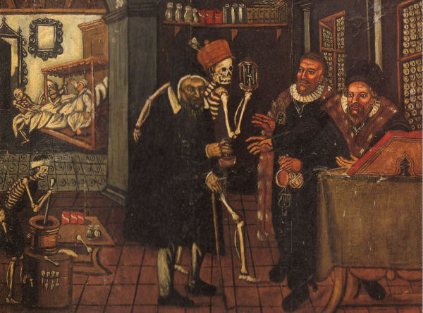 Unsere Abbildung zeigt Tafel 11, die drei Szenen vereint: der Arztbesuch vorne rechts und die Gerippe am Bett einer Schlafmütze bzw. eines Kranken gehen auf Hans Holbein zurück. Das Apothekerskelett vorne links variiert dagegen den Assistenten des Malers im Basler Totentanz. Man könnte meinen, Thomas Rowlandson habe dieses Gemälde 1814 als Vorlage für seinen "English Dance of Death" benutzt.