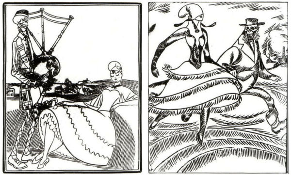 Im Ersten Weltkrieg diente Karl Arnold (*1883 Neustadt bei Coburg - 1953 München) als Pressezeichner des Deutschen Heers an der Westfront. Er war zuständig für die "Kriegsflugblätter", also die illustrierte Beilage der "Liller Kriegszeitung". Bis 1917 erschienen darin rund 300 Graphiken von seiner Hand, darunter die beiden oben abgebildeten Beispiele. Das Titelblatt des Hefts Nummer 20 vom 28. September 1916 heißt "Aufforderung zum Tanz". Links außen bläst der knochendürre Schotte in den Dudelsack; ihm lauscht rechts daneben die hübsche Französin Marianne. Im Heft Nummer 115 vom 10. Juli 1917 ist der jungen Dame die phrygische Mütze, das Symbol freiheitlich-demokratischer Gesinnung, über die Augen gesunken. Die dergestalt Erblindete tanzt nunmehr mit dem wohlgenährten Engländer John Bull über Bombentrichter. Vor Gefahren warnend sind diese Bilder keineswegs: Der Künstler bedient sich des Totentanzmotivs und nationalistischer Klischees, um den Soldaten klar zu machen, wer der Kriegstreiber und wer das naive Opfer ist. Das weiblich-schwache Frankreich hat sich durch Großbritannien zum Krieg verführen lassen und ist somit zum orientierungslosen Handlanger des Todes geworden.