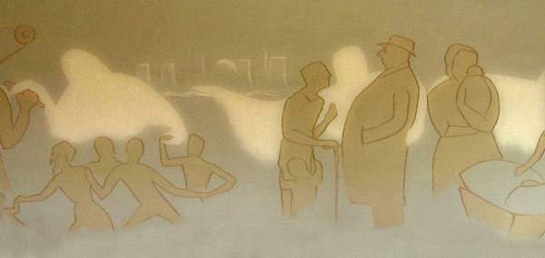 Fritz Kehr (1908-1985) bemalte die Innenwände der Aussegnungshalle in Worms-Ibersheim mit einem Totentanz, in dem es um die lebensgefährlichen Auswirkungen radioaktiver Strahlung geht. Für den als Künstler wie als Heimatforscher dilettierenden Landwirt lag das Thema nahe, seit auf der seinem Wohnort gegenüber liegenden Rheinseite die Bauarbeiten am südhessischen Kernkraftwerk Biblis begonnen hatten, das im Februar 1975 den Betrieb aufnahm. Zeitgleich entstand die dreieckige Friedhofshalle des rheinpfälzischen Mennoniten-Dorfs Ibersheim. Für die Innenausstattung sorgte Fritz Kehr, der auf dem in der Ecke gegenüber der gläsernen Eingangsfront angebrachten Altar den Leichnam Christi darstellt. Rechts und links davon fordert der Tod unsichtbar verborgen unter schneeweißen Laken sein Opfer: Er holt den zur Gemeinde sprechenden Prediger. Unterbrochen vom Rednerpult und der Tür zur Sakristei folgt eine vielfigurige Szene: Die personifizierte Kernenergie breitet ihre Arme aus wie Vogelflügel und umschließt damit zwei Fußball spielende Knaben, den Patient im Krankenbett, Arzt und Schwester zugleich. Um die Ecke zum Eingangsbereich haben der Maler, der Architekt und ein Bauhandwerker Raum gefunden, doch zwei Todesgestalten unterbrechen ihre Tätigkeit. Auf der Rheinseite geht es beinahe idyllisch zu, denn je ein atomarer Artgenosse schlingt seinen Arm sanft um die Schulter des Bauern wie des Jägers und des Maschinisten. Im Mittelpunkt der Wand steht das Kraftwerk Biblis, vor dem sich Vertreter aller Lebensalter versammeln. Kinder tanzen Ringelreihen, alte Herren unterhalten sich, eine Mutter hebt ihr Baby aus der Wiege. Weiter rechts sieht man Menschen unterwegs, Flüchtlinge womöglich. Mobilität ist dann noch einmal Thema auf der kurzen Mauer der Eingangswand. Hier stoppt der Tod den Verkehr. Die Autobahn, der Luftraum und die Schifffahrt sind gleichermaßen betroffen.