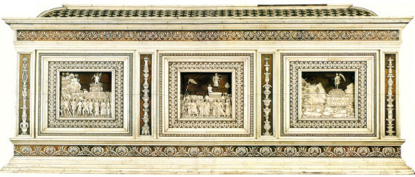 Jedes der frontalen Reliefs stellt einen Triumphzug frei nach Francesco Petrarca dar: Liebe, Keuschheit und Tod, Ruhm, Zeit und Ewigkeit ziehen am Betrachter vorbei. Die dritte Szene ist dem Etappensieg des Sensenmanns gewidmet, dessen von Ochsen gezogenes Gefährt über Leichen aller Stände rollt. Erkennbar sind Papst und König, Mönche, ein Ritter sowie junge Männer und Frauen. Leider sieht sich kaum jemand die Schnitzerei genauer an. Der fahrbare Untersatz des Triumphators entpuppt sich dann nämlich als Sarkophag, auf dessen Langseiten sich Gerippe mit aufgeschlitzten Bauchhöhlen Hand in Hand zum Reigentanz vereint haben, frohgemut grinsend, wie es scheint.