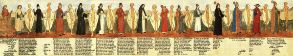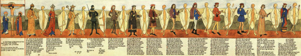 Mitten in Berlin, links hinter der Eingangstür der Marienkirche, befindet sich der älteste erhaltene monumentale Totentanz des deutschsprachigen Raums. Die um 1470 entstandene Wandmalerei in der Turmhalle besteht aus vier Teilen: Ein Franziskaner, dessen Predigt ursprünglich ein dämonischer Dudelsackspieler störte, leitet in das Geschehen ein. Vor der Kanzel sind die Geistlichen aufgereiht, aufsteigend vom Küster bis hin zum Papst. Den Scheitelpunkt der Figurenfolge markiert die Kreuzigungsgruppe in der Nordwestecke. Vom Betrachter aus rechts schließen sich weltliche Ständevertreter an: Adelige, beginnend mit dem Kaiser, reiche Bürger und weniger wohl situierte Leute, wie die Wirtin und ursprünglich einmal der Narr. Im ausgehenden Mittelalter bestand das Totentanzpersonal aus 26 Paaren, zu denen je eine Doppelstrophe aus 2 x 6 Verszeilen gehörte. Wie üblich hatte der Tod das erste Wort; seine Opfer antworteten mal stolz, mal schuldbewusst. Obwohl sich der Fries nur über zwei Wände erstreckt, deuten die Bilder einen Reigentanz an: den Aufzug zu oder um Gottes Sohn, der sein Leben zum Wohle der Menschheit geopfert hat.