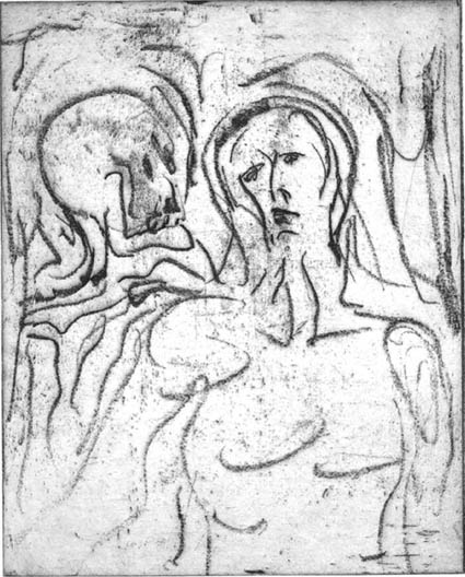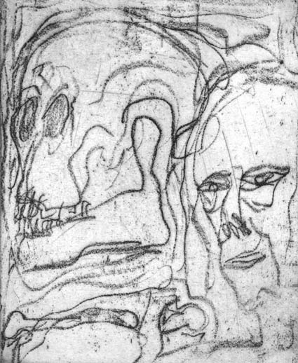 ”Der tanzende Tod” Radierung, dem Buch ”Heinrich Heine - Traumbilder” beigelegt. 2003, ca. 20 x 17 cm