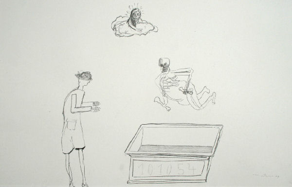 In den Zeichnungen von Nikolaus Mohr findet sich die Unausweichlichkeit des Todes sowohl in den Mausefallen, als auch bei dem Totenkopf Mickey, aber auch in der Zeichnung "Der Tod und der Künstler". Ein offener Sarg mit dem Geburtsdatum des Künstlers, darüber schwebt ein Tod, der mit zwei Knochen winkt und mit dem Takt der Schläge den mit verbundenen Augen wandelnden Künstler lockt. In dieser Zeichnung finden sich viele Anklänge zu den Totentanzbildern des Mittelalters: der Lebende, auf seinen Tod zugehende Mensch, der blind ist für den Zeitpunkt und den Augenblick des Todes, der nicht um die Zeit, nicht um den Ort, nicht um den Umstand seines Sterbens und seines Todes weiß. Er weiß, dass zu dem Geburtstag einst auch ein Todestag gehört. Über der Szenerie des verarmten Künstlers, der seinem Tod, seinem Sarg entgegengeht, und dem ihn lockenden und erwartenden Tod, schaut aus einer Wolke Gott Vater auf diese Szenerie.