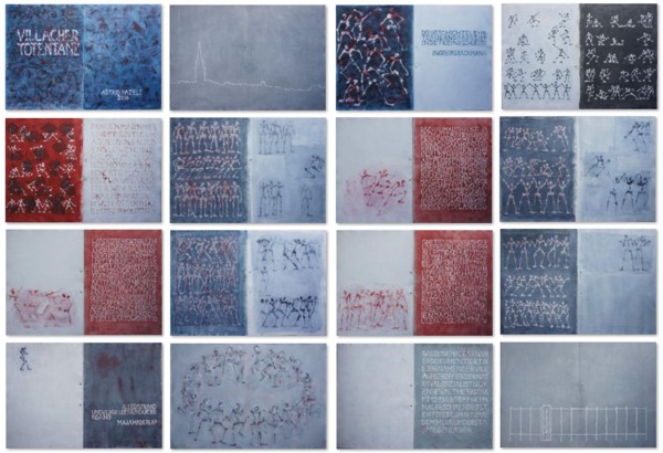 Villacher Totentanz, 32 Seiten, Acryl auf Leinwand, 42 x 31 cm, mit einer Kordel gebunden und versiegelt.