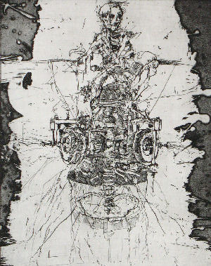 Helmut Anton Zirkelbach, Jahrgang 1962, ist Autodidakt und beherrscht sein Metier doch perfekt. Das beweisen nicht nur seine großformatigen makabren Gemälde, sondern insbesondere der "Albstädter Totentanz", ein Radierzyklus, der das Ende der Textilindustrie als apokalyptische Vision darstellt, wobei Strickmaschinen und Totenschädel einen irrwitzigen Tanz vollführen. Die Bilder entstanden seit 2008 in Kohlstetten auf der schwäbischen Alb, wo der Künstler lebt und arbeitet.