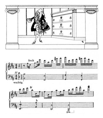 bewacht von einem buckligen Diener mit Schnallenschuhen und gepuderter