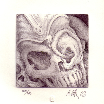 Manuel Götz: Tanzende Schädel, 2008, Kupferstich im Format 8 x