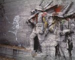 Graffiti zum Kriegerdenkmal in Düsseldorf, 1980er Jahre, zerstört. |