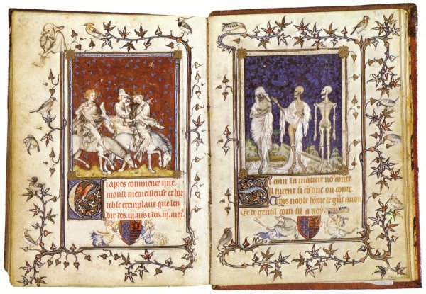 Lebenden und der drei Toten, Darstellungen von Gerippen, die über